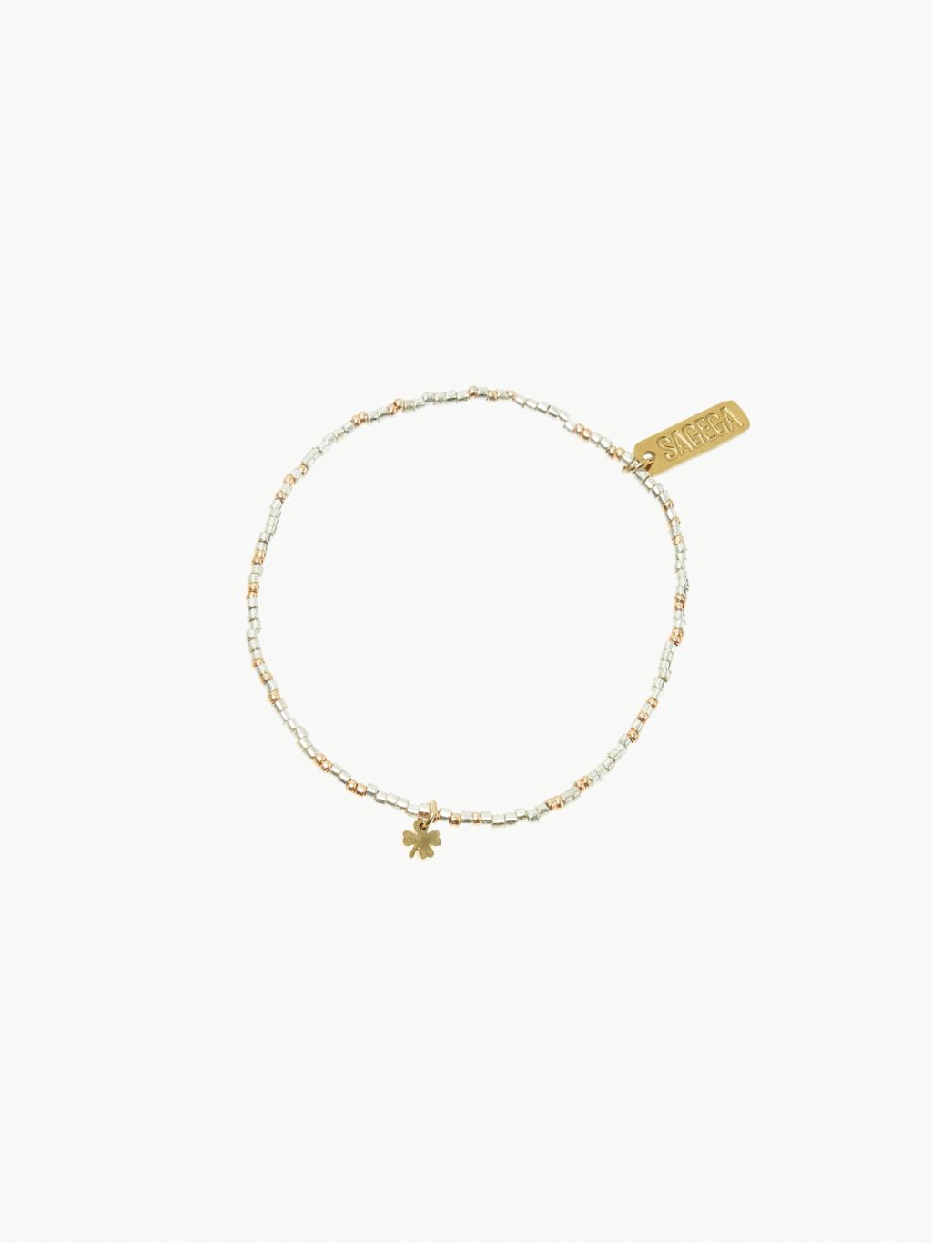 - 작은 비즈들이 불규칙하게 모여 만들어낸 독특한 브레이슬릿 - 미니사이즈 네잎클로퍼 참 펜던트 디테일 - 블랙/골드 , 실버/골드 두 가지 컬러 - 손목에 가볍게 둘러주는 스트레치 타입(고무줄)로 간편하게 착용 가능 - 로고 각인 펜던트 |
